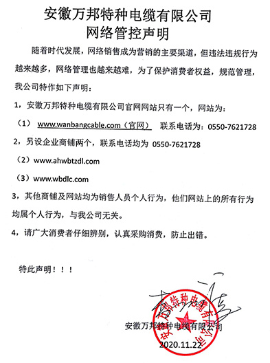 鄭重聲明:安徽萬邦特種電纜有限公司官方網站為:www_wanbangcable_com.myowen.cn,除此之外無任何子網站或合作網站,其余均為假冒偽劣。電話:0550-7621728 13485756353 地 址:安徽省天長市滁州高新技術產業開發區經四路29號